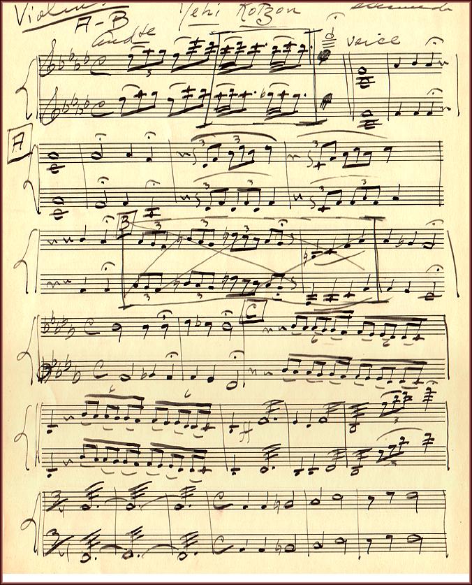 | Title: | Yehi Rotzonby Sholom Secunda. To be performed at the "Kedushah" (morning service) on Shabbat and Festivals. Cantorial Music. Orchestral Parts. Violin Part Page 1 |