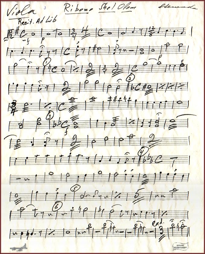 Ribono Shel Olom (Hotsias HaTorah)by Sholom Secunda. A private meditation performed on the morning of Shabbat, High Holidays and Festivals. Cantorial Music. Orchestral Parts. Viola Part