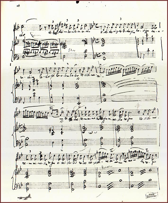 | Title: | Ribono Shel Olom (Hotsias HaTorah)by Sholom Secunda. A private meditation performed on the morning of Shabbat, High Holidays and Festivals. Cantorial Music. Orchestral Parts. Piano Vocal Score Page 4 |