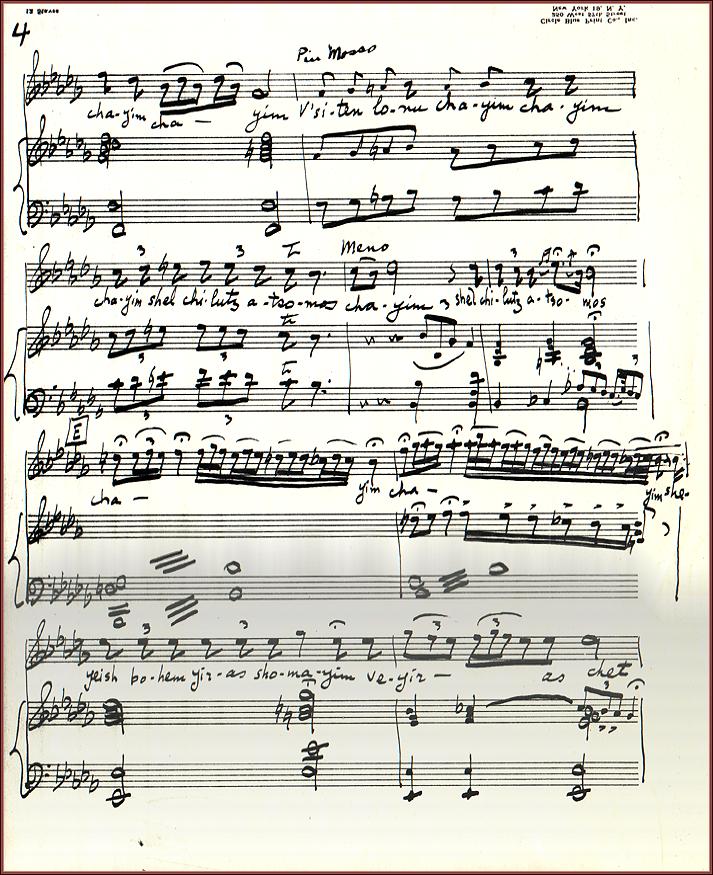 | Title: | Yehi Rozonby Sholom Secunda. To be performed at the "Kedushah" (morning service) on Shabbat and Festivals. Cantorial Music. Orchestral Parts. Piano Vocal Score Page 4 |