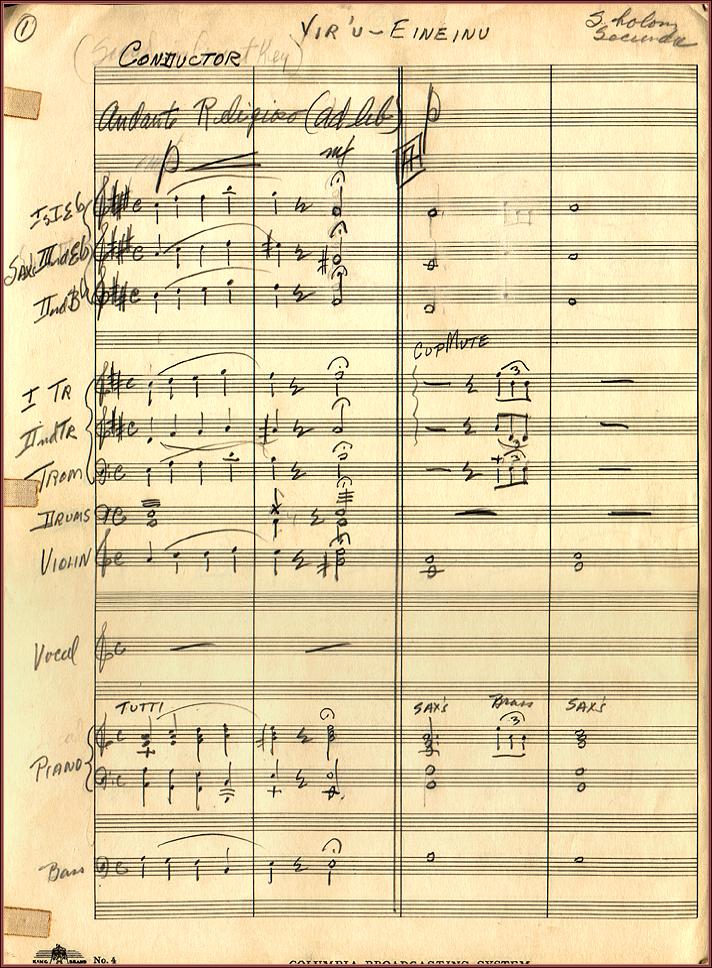 Yiru Eineinuby Sholom Secunda. To be performed during the daily evening service. Cantorial Music. Orchestral Parts. Full Score Page 1