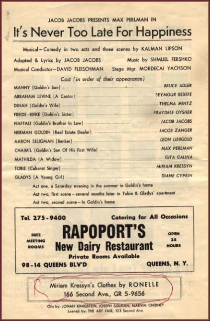 | Title: | program for It's Never Too Late for Happiness, a remake of The Lithuanian Yankee, starring Max Perlman, Gita Galina, Leon Liebgold, Jacob Jacobs, Miriam Kressyn, Seymour Rexite, Diane Cypkin, Thelma Mintz, Bruce Adler, Jacob Zanger, Samuel Fershko, Mordecai Yachson and Fraydele Oysher, at the Anderson Yiddish Theater, 2nd Avenue, New York City ,1968, p.2 |