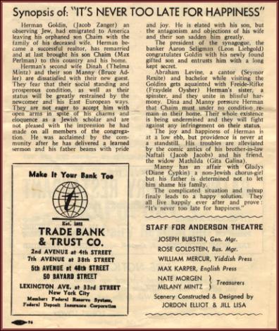 | Title: | program for It's Never Too Late for Happiness, a remake of The Lithuanian Yankee, starring Max Perlman, Gita Galina, Leon Liebgold, Jacob Jacobs, Miriam Kressyn, Seymour Rexite, Diane Cypkin, Thelma Mintz, Bruce Adler, Jacob Zanger, Samuel Fershko, Mordecai Yachson and Fraydele Oysher, at the Anderson Yiddish Theater, 2nd Avenue, New York City ,1968, ,p.4 |