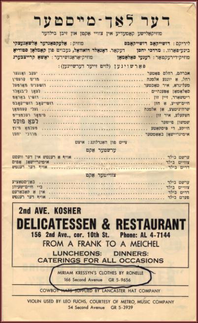 | Title: | program for The Laughmaker, starring Leo Fuchs, Jacob Jacobs, Miriam Kressyn, Leon Leibgold, Seymour Rexite, Thelma Mintz, Janece Martel, Mordecai Yachson, Jacob Zanger, Nellie Casman, Gene Barrett and Renee Soloman at the Eden Yiddish Theater, 2nd Avenue, New York City,p.3 |