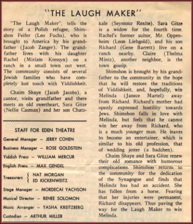 | Title: | program for The Laughmaker, starring Leo Fuchs, Jacob Jacobs, Miriam Kressyn, Leon Leibgold, Seymour Rexite, Thelma Mintz, Janece Martel, Mordecai Yachson, Jacob Zanger, Nellie Casman, Gene Barrett and Renee Soloman at the Eden Yiddish Theater, 2nd Avenue, New York City,p.4 |