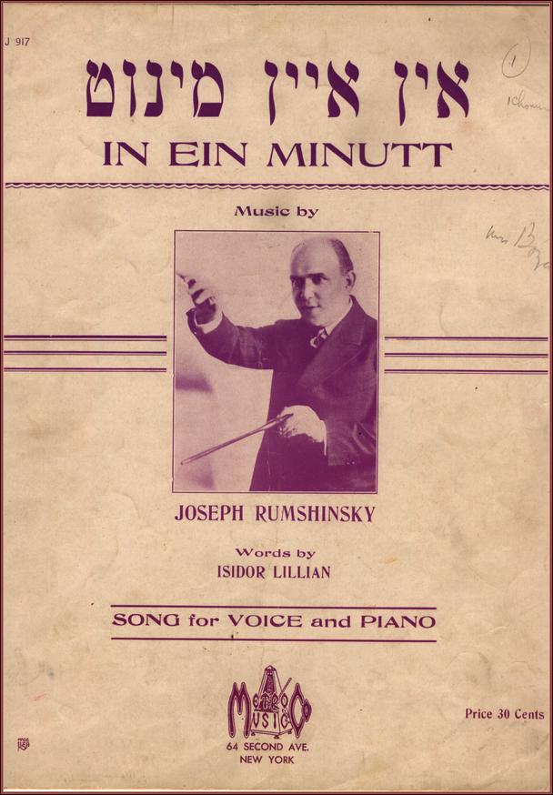 Joseph Rumshinsky. "In ayn minut"," lyrics by Isidor Lillian. New York: Metro Music Co. Cover Page 1