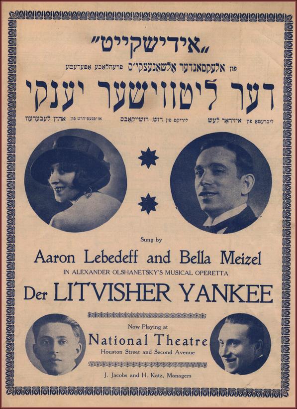 Sheet music for "Yidishkayt", a duet from the operetta The Lithuanian Yankee starring Aaron Lebedev and Bella Meisel with music by Alexander Olshanetsky, and lyrics by Jacob Jacobs, p.1 Page 1