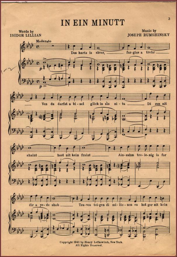 Joseph Rumshinsky. "In Ayn Minut," lyrics by Isidor Lillian. New York: Metro Music Co. Page 3