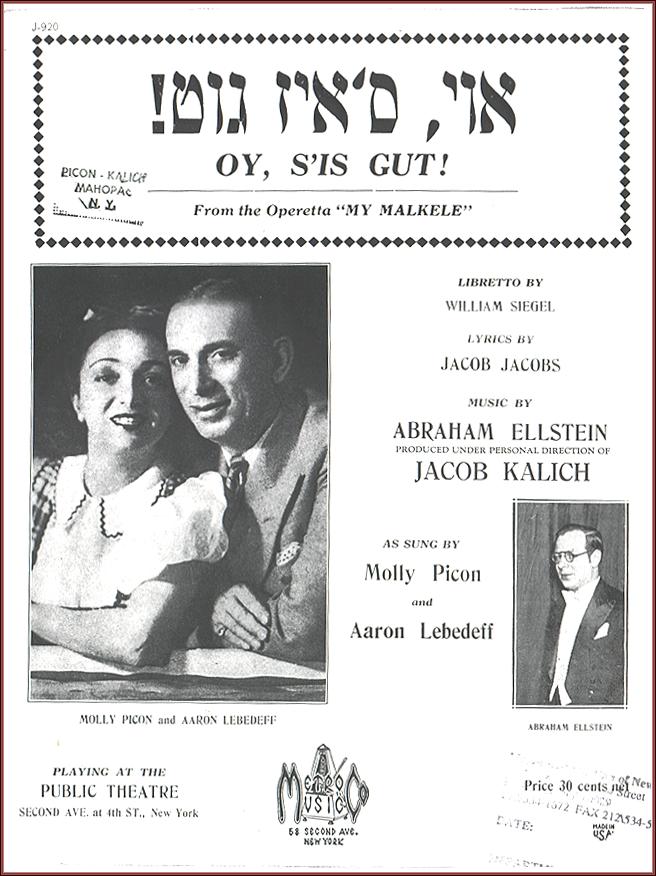 Molly Picon and Aaron Lebedev on the sheet music for "Oy, that's good" from the operetta Malkele composed by Abe Ellstein at The Pulic Theater