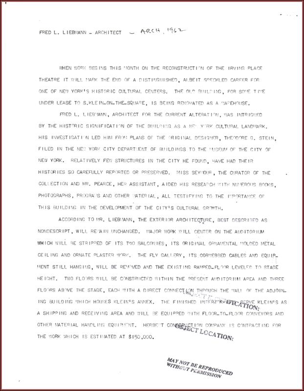 | Title: | Notes on the renovation of the Irving Place Theater |