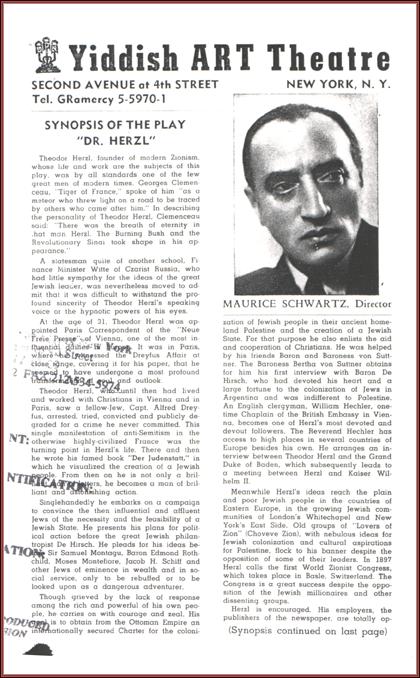 Maurice Schwartz's Yiddish Art Theater program for H. Leivick's Who is Who advertising the play Dr. Herzl