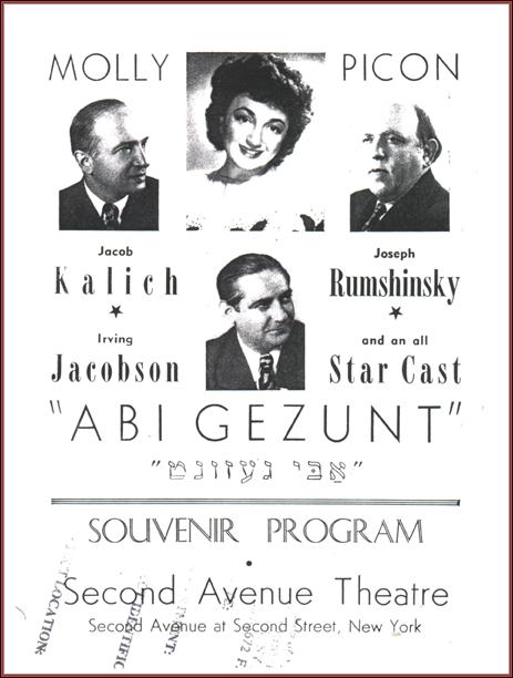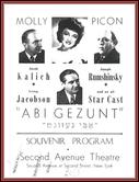 | Title: | Souvenir program for Abi Gezunt at the Second Avenue Theater starring Molly Picon and Irving Jacobson and writtten by Jacob Kalich and Joseph Rumshinksy |