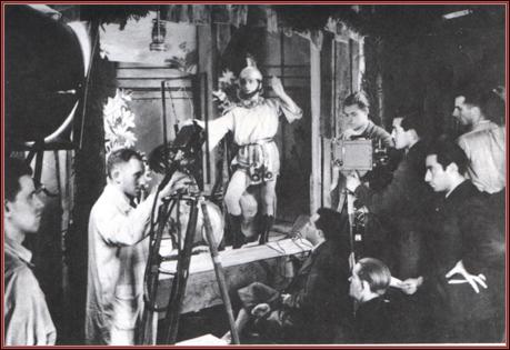 The film Di Freylekhe Kabtsonim (Jolly Paupers) (1937), starring Zygmund Turkow, his daughter Ruth Turkow, Shimen Dzigan, and Yisroel Schumacher. The "helmeted warrior" in the center is Menashe Oppenheim