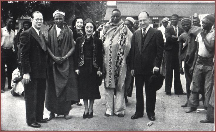 | Title: | The "Flying Dutchmen", Jacob Kalich (from right), Molly Picon and the composer Abe Ellstein on a visit, in 1937, to South Africa, are honored by a group of Zulus |