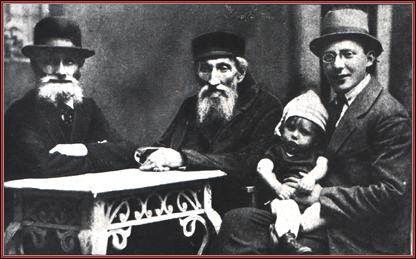 Jacob Zylberzcweig, to the left his son Heschto the right his grandson Zalmen, with Jacob's Great-grandson (Zalmen's cild Absalom) on his knees. Taken in Lodz, in 1920.