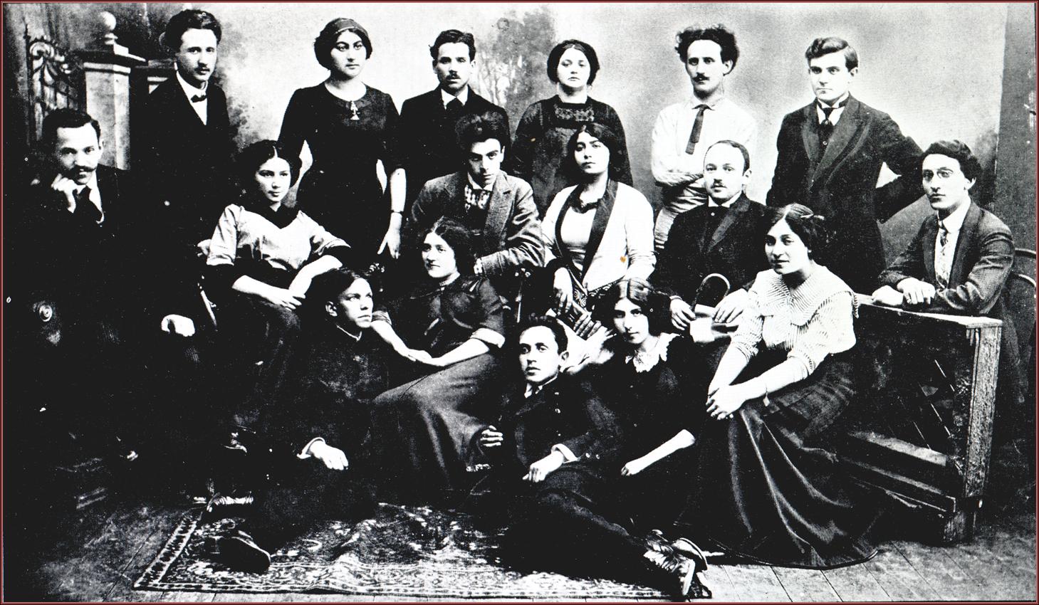 | Title: | The group Jacob Ben-Ami coached in 1912 in Vilna ; first to the left, standing, is Jacob Lubotsky; first to the right,standing, Chaim Schneyer. Sitting, center, Jacob Ben-Amy; below him-Sonia Aloomis; first to the rigt, sitting, Sonia Gurskaya. |