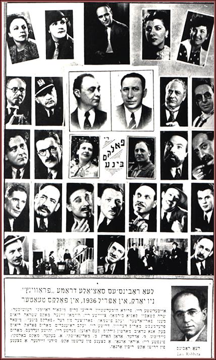 | Title: | "FOLKSBIHNE" ENSEMBLE IN LEO ROBBINS' SOCIAL DRAMA, The Grandpa of Brownsvile," New York, April 1936, at the Folks Theater.Top Row: Sonia Birman, Sarah Stabin, Michael Rasumni(director), Lillian Blum, Fread Himelstein; Second Row: Morris Derwin, Michael Predmest, Jacob Fishman(chairman of the Folksbihne),Louis Mann(manager), Max Strahl, Hyman Zeiner;Third Row: Sam Rosen, Martin Gulkis, Anna Traub, Louis Beck, Morris Polack, Jacob Rosenbloom; Forth Row: Max Balsky, A.Becker, M. Malinovsky, Aron Holz, M. Adler, Moris Neiditsh, Joshua Zeldes; Bottom: Robin Arnow, a scene from the first act, Eli Arnow |