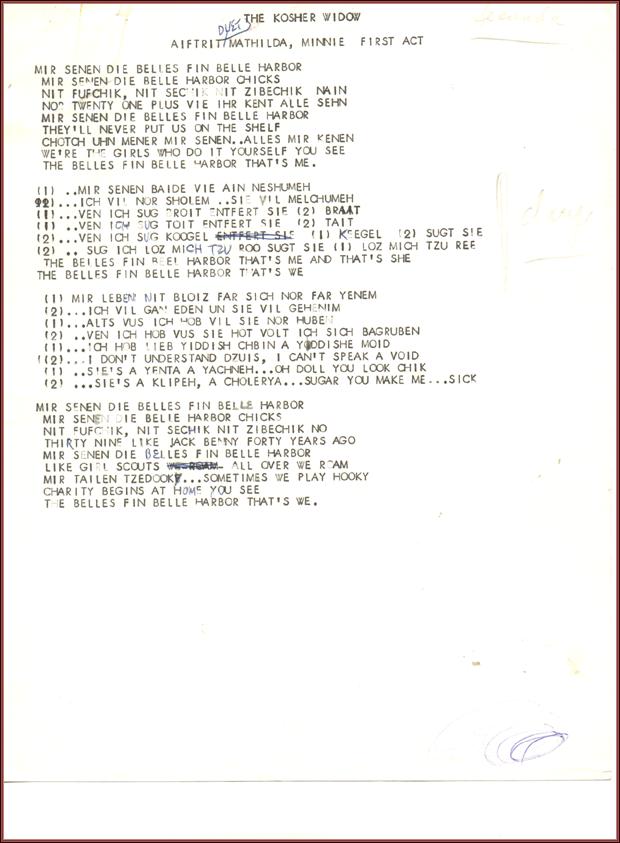 | Title: | The Kosher Widow by Sholom Secunda. Miscellaneous Scores and Parts. Lyric sheet: "Aftret duet, Mathilde, Minnie" |