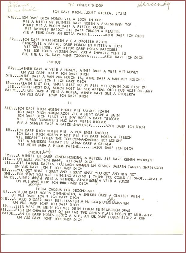 The Kosher Widow by Sholom Secunda. Miscellaneous Scores and Parts. Lyric sheet: "Ikh Darf Dikh"