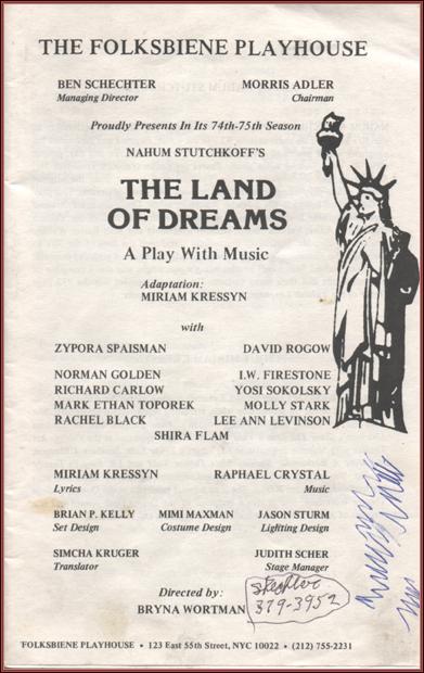| Title: | Program for Miriam Kressyn's adaptation of Nakhum Stutchkoff's The Land of Dreams at the Folksbiene Playhouse with Zypora Spaisman and David Rogow |