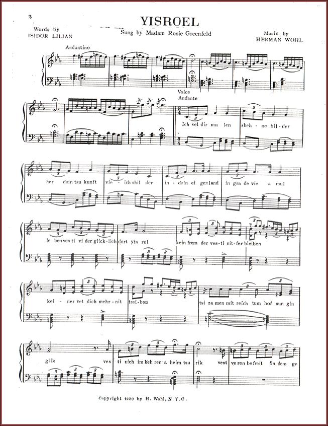 | Title: | Music for "Yisroel" from the Isidor Lillian musical Justice to the Jew originally sung by Rose Greenfeld and starring Jacob Adler with music by Herman Wohl at Thomashefsky's Theater, page 2 |