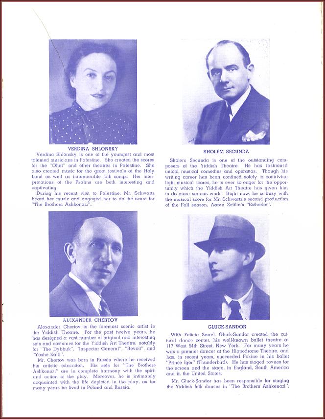 | Title: | Program for Maurice Schwartz's production of I.J. Singer's Brothers Ashkenazi with bios of Sholom Secunda, Verdina Shlonsky, Alexander Chertov and Gluck-Sandor |