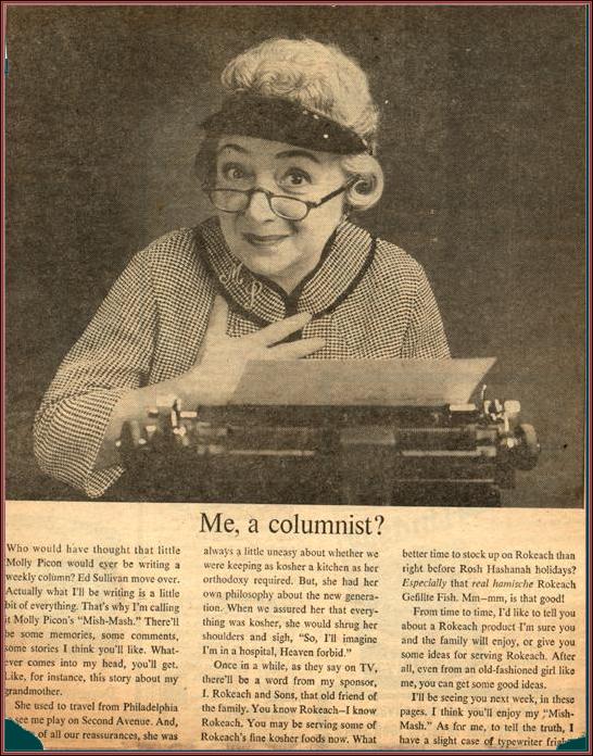 | Title: | An advertisement for Molly Picon's newspaper column "Mish Mash" |