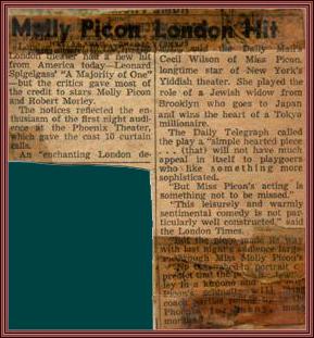 | Title: | Molly Picon receives rave reviews in the London production of A majority of one opposite Robert Morley |