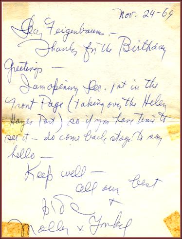| Title: | Molly Picon writes a letter to the Feigenbaums mentioning taking over Helen Hayes' part in Front Page |