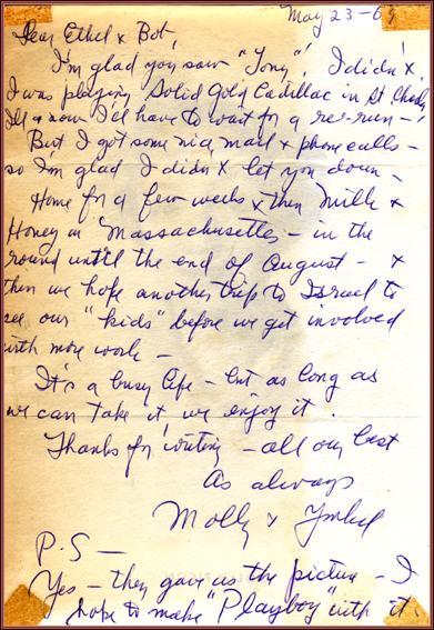 | Title: | a letter from Molly Picon to the Feigenbaums mentioning her work in Milk and Honey and Solid Gold Cadillac |
