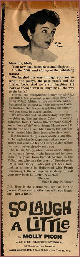 | Title: | An advertisement for Molly Picon's book So, Laugh a Little |