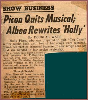 | Title: | Molly Picon quits the musical Chu Chem after disputes with costar Menashe Skulnik. Henrietta Jacobson takes over |