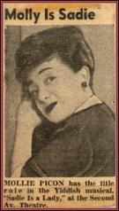 | Title: | Molly Picon in a newspaper clipping announcing her as the lead in Sadie is a Lady at the Second Avenue Theater |