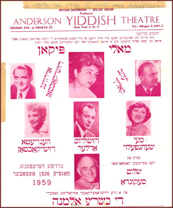 | Title: | Poster for The Kosher Widow with music by Sholom Secunda and starring Molly Picon, Jacob Kalich, Irving Jacobson, Mae Schoenfeld, Julius Adler and Henrietta Jacobson |