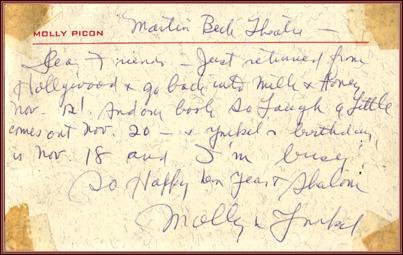 | Title: | a card from Molly Picon to the Feigenbaums mentioning Milk and Honey and her book So, Laugh a litte |