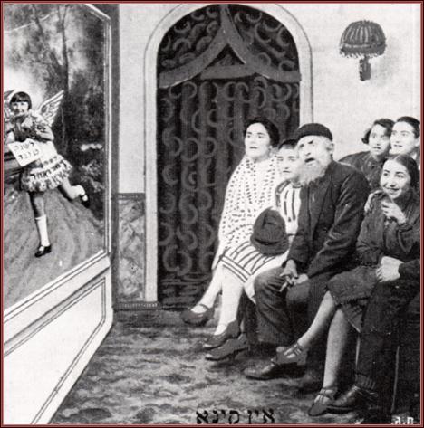 | Title: | In Kino (At the Movies), a Jewish New Year's card, printed in Warsaw, circa 1910. |