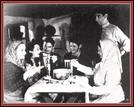 Edgar G. Ulmer (standing) studies the shabes scene on the set of Di Klyatshe. David Opatoshu (fourth from left) smiles as an unidentified visitor to the set spoonfeeds Helen Beverly.