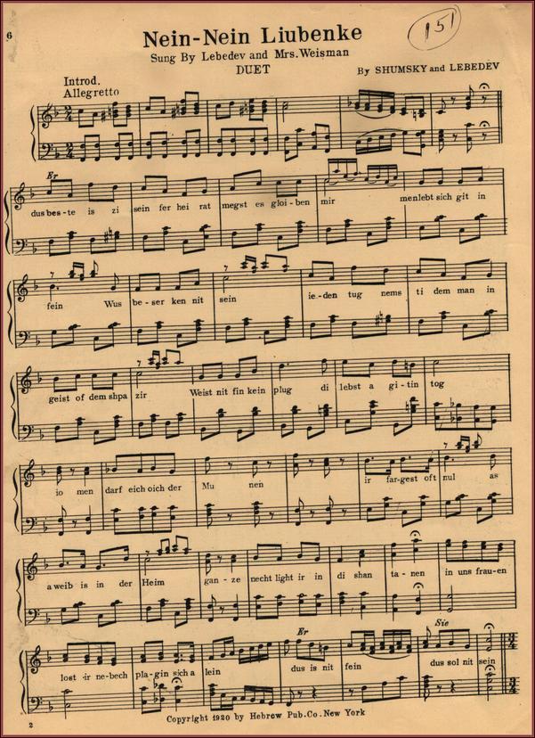 sheet music from Liovka Maladiets, words and music by Shumsky and Aaron Lebedev, p.1(includes sheet music for Blimelakh, Meydelakh Sheyninke, Neyn Neyn Luibinke, Oi Di Meydelakh) p.6 Page 6
