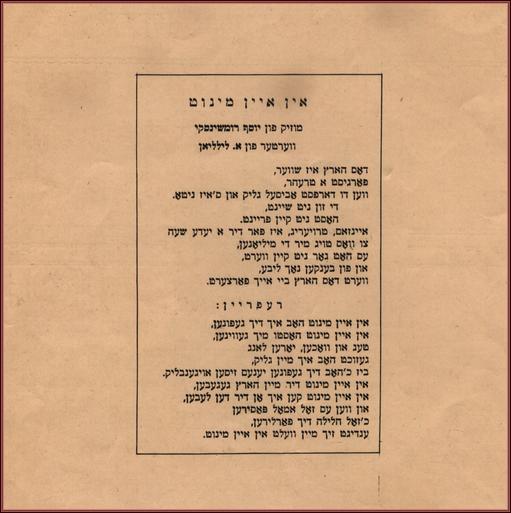 Joseph Rumshinsky. "In Ayn Minut," lyrics by Isidor Lillian. New York: Metro Music Co. Inside front cover Page 2
