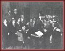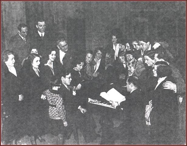 | Title: | Molly Picon, Abe Ellstein, Jacob Kalich and cast around the piano at rehearsal |