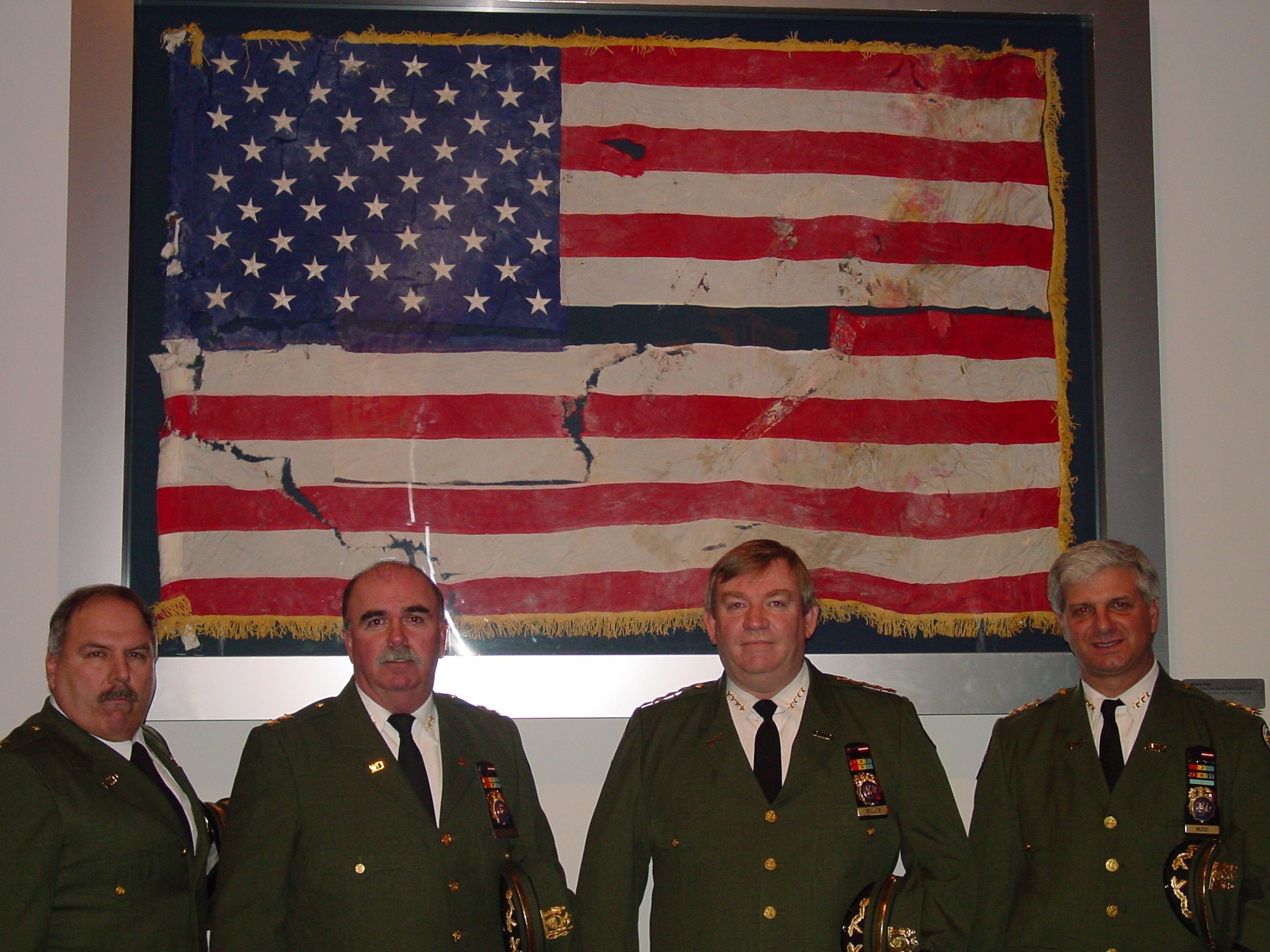 Abstract: Photograph taken from New York State Museum, Albany, NY. of four SDNY officers and an American flag recovered from ground zero.